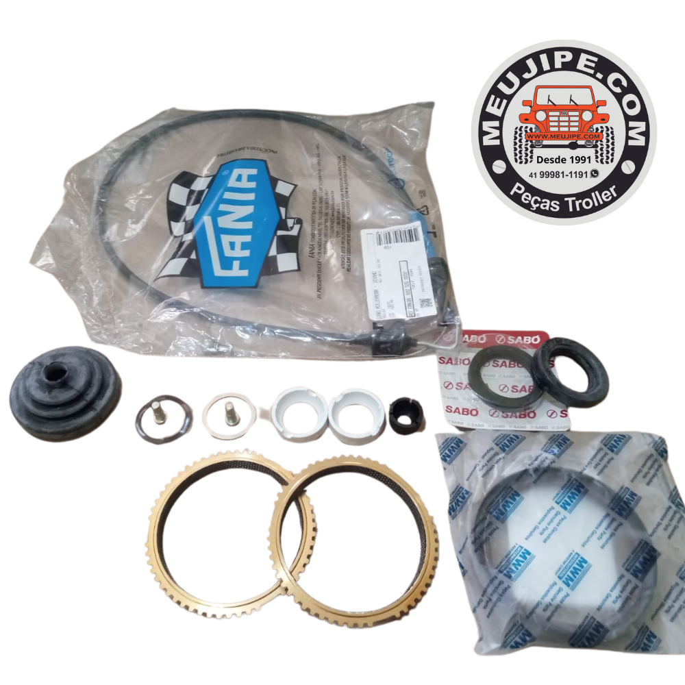 KIT PEÇAS ARVOREZINHA - RS 2 ANEL SINCRONIZADO FIBRA CARBONO CAMBIO EATON 2305 MEUJIPE 1 REPARO ALAVANCA MARCHAS MEUJIPE 1 RETENTOR TRASEIRO VIRABREQUIM MWM 1 RETENTOR EIXO PILOTO SABO 1 RETENTOR TRASEIRO CAMBIO SABO 1 CABO ACELERADOR FANIA